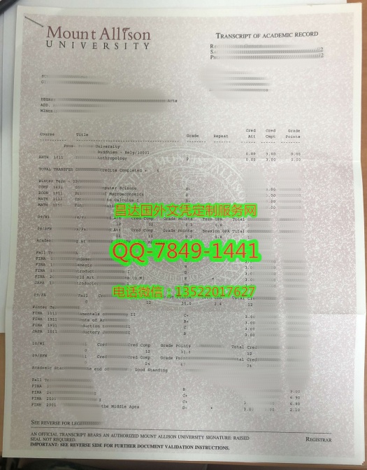 定制加拿大蒙特爱立森大学成绩单Mount Allison University Diploma