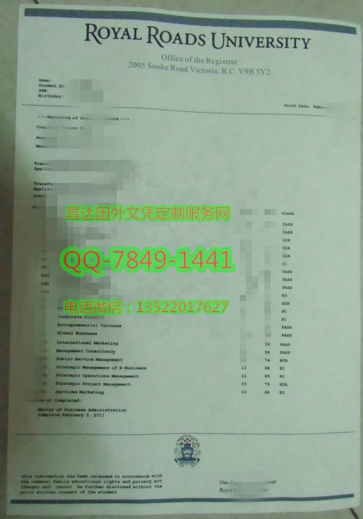 定制加拿大皇家大学成绩单Royal Roads University Diploma
