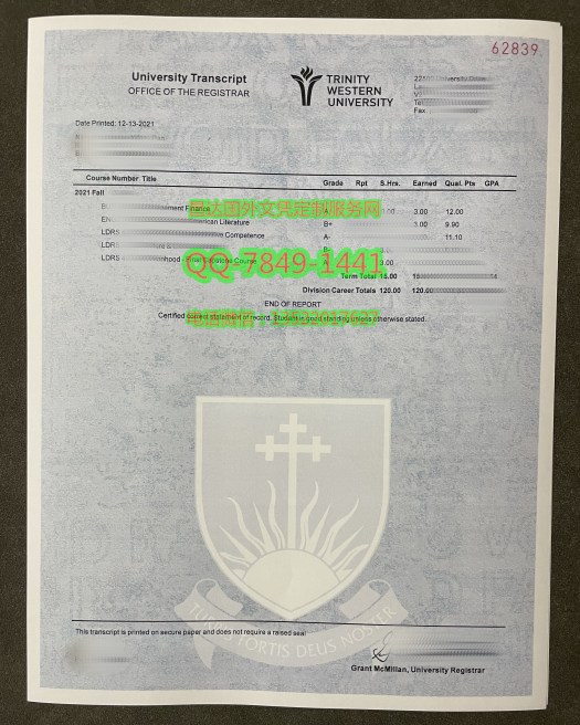 定制加拿大西三一大学原版成绩单Trinity Western University Diploma