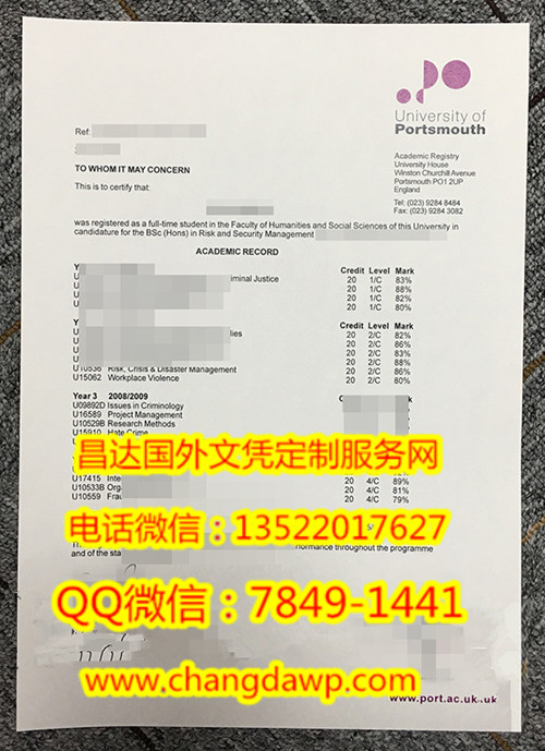 朴茨茅斯大学成绩单展示University of Portsmouth Diploma