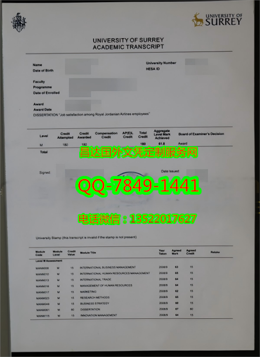 定制英国萨里大学成绩单University of Surrey Diploma